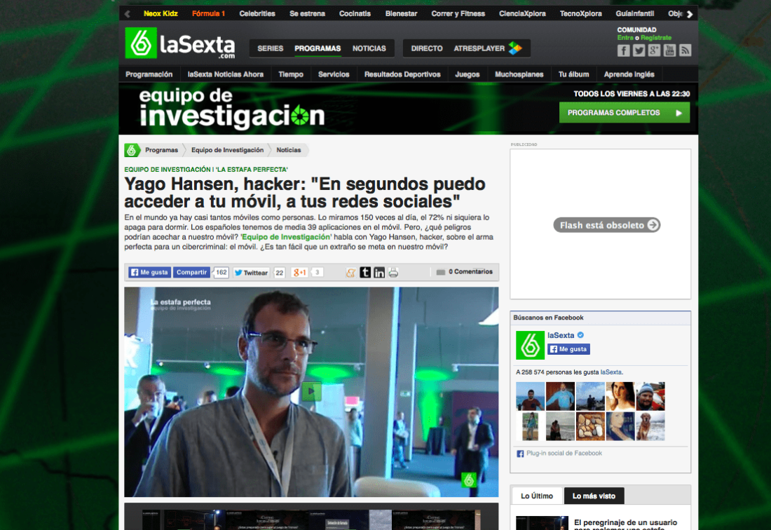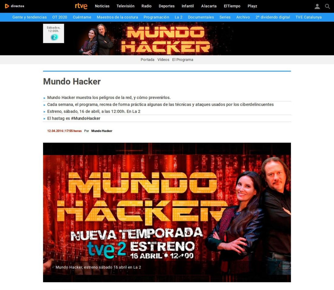 The 2 Noticias de Radio Televisión Española is the most reliable news network in Spain. In 2016 they made a short report about cybersecurity news at Mundo Hacker Day 2016 in which Yago Hansen participates by showing their developments.