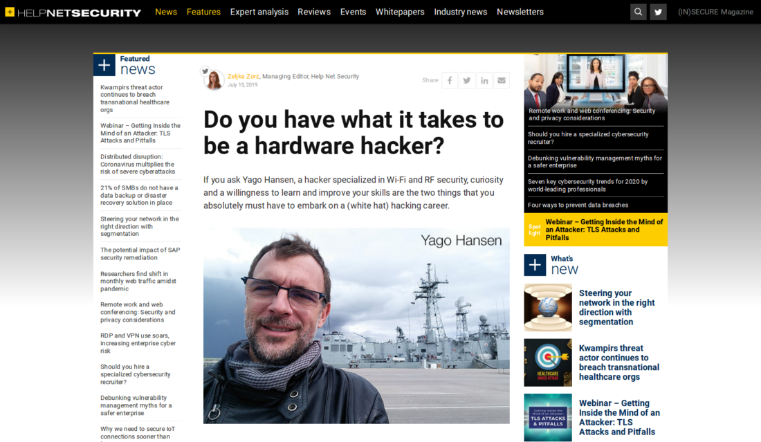 HelpNetSecurity added an interview of Yago Hansen about hardware hacking. Do you have what it takes to be a hardware hacker? If you ask Yago Hansen, a hacker specialized in Wi-Fi and RF security, curiosity and a willingness to learn and improve your skills are the two things that you absolutely must have to embark…